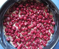 8. Die Hälfte des Rührteiges auf den ungebackenen Mürbeteigboden streichen und die Kirschen darauf verteilen.