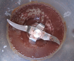 13. Die restliche geraspelte Zartbitterschokolade in den Mixtopf geschlossen"Mixtopf geschlossen" geben und mit der Kaffeesahne 2,5 Min. / 50 °C / St. 2 schmelzen. Evtl. zwischendurch die Masse mit dem Spatel nach unten schieben.