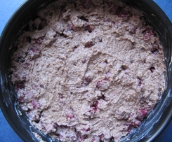 9. Den restlichen Teig darüber streichen. (So stand es im Originalrezept, aber beim nächsten Mal werde ich vielleicht die Kirschen direkt mit dem fertigen Rührteig vermengen (mit dem Spatel) und alles zusammen auf den Mürbeteigboden geben.)