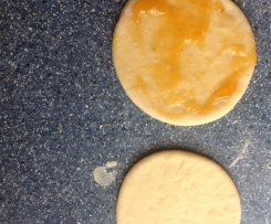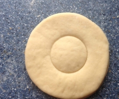 Nun den Teig ausrollen und Kreise ausstechen und immer einen Kreis mit Marillenmarmelade bestreichen.