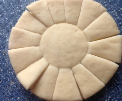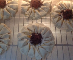 in die Mitte etwas Marillenmarmelade streichen und mit geriebener Schokolade bestreuen. Bei 180° Ober-und Unterhitze ca.20 Min. backen.