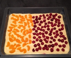 Kirschen auf 2/3 des Teiges verteilen, den Rest mit Mandarinen belegen. Tipp: Obst vorher nicht längere Zeit in Sieb abschütten, dann bleibt alles schön saftig.