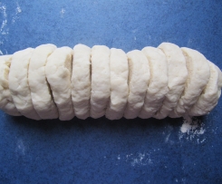 Teig auf einer leicht bemehlten Arbeitsfläche zu einer dicken Rolle mit ca. 5,5 cm Durchmesser formen und in 12 Scheiben schneiden.