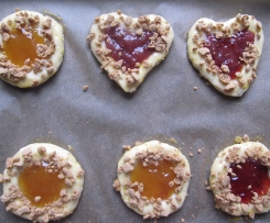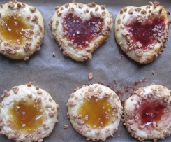 Marmelade in die Mulden füllen. Mit gelber Marmelade (z. B. Aprikosenmarmelade) sehen die Taler ein bisschen aus wie Spiegeleier - schön zu Ostern. Wenn man Gelee verwendet, wird dieses beim Backen sehr flüssig und verläuft ziemlich stark.