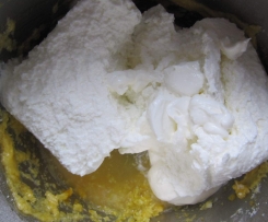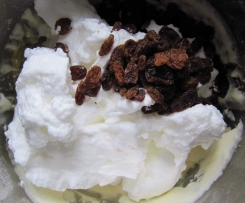 Den Quark abtropfen lassen und zusammen mit der Crème Fraîche und dem Vanillepuddingpulver hinzufügen.