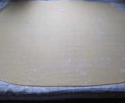 Den Teig darauf dünn zu einem Rechteck von 50 x 60 cm ausrollen. Das Tuch evt. etwas fixieren, damit es nicht so rutscht. Wenn der Anfang gemacht ist, geht das Ausrollen aber super. Die Teigplatte 10 Minuten ruhen lassen.