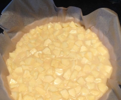 Stufe 2 mit Hilfe des Spatels unterrühren. - In eine mit Backpapier ausgelegte und danach noch leicht gefettete Tarte-Form füllen und bei 190° C 45 min. gold-gelb backen. Nach der Häfte der Zeit evt. mit Alufolie abdecken...