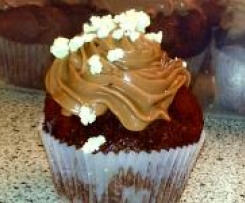 - Rühraufsatz einsetzen, Puderzucker, Butter, Frischkäse, zugeben, 2 Min. 30 Sek./ Stufe 3 aufschlagen, in eine Spritztülle füllen und die abgekühlten Cupcakes damit verzieren und mit der restlichen weißen Schokolade dekorieren