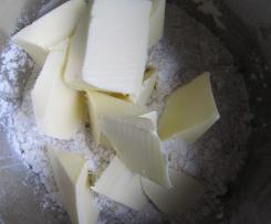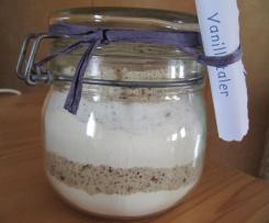 Ein Glas Backmischung für Vanilletaler, 170 g kalte Butter, etwas Puderzucker zum Bestäuben