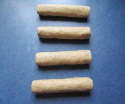 - Den Teig auf der Arbeitsplatte von Hand "nachformen" und in vier Stücke teilen. Daraus Rollen von ca. 3 cm Durchmesser formen. In Folie gewickelt ca. 1 Stunde im Kühlschrank kalt stellen.