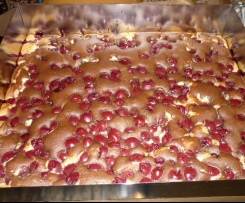 Die Hälfte des Teiges auf ein mit Backpapier belegtes Blech streichen. Die andere Hälfte des Teiges mit 2 EL Kakaopulver 20 Sek./ Stufe 5 verrühren. Auf dem hellen Teig eben streichen. Die abgetropften Sauerkirschen gleichmäßig auf dem Teig verteilen.