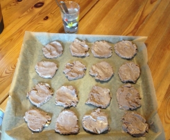 Zwei Esslöffel in einem Glas lauwarmen Wassers immer wieder anfeuchten und 16 große Cookies auf ein Blech setzen und plattdrücken.