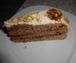 Den Tortenboden 2 mal gleichmässig durchschneiden und die Böden mit Orangenmarmelade od. anderer gewüschter Konfitüre bestreichen! Die Böden aufeinandersetzen und mit der steif geschlagenen Sahne den Rand und Deckel der Torte garnieren! Zum Schluss mit Walnusshälften und Orangenspalten dekorieren! Für den Rand geben sie ca. 50 Gramm Walnusskerne kurz in den