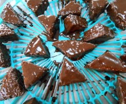 "Mixtopf geschlossen" die stückige Kuvertüre mit dem Kokofest fein mahlen 6-10 Sec/Stufe 10.Den Deckel öffnen und die Schokolade etwas nach unten schieben. Danach 3 Min./50°/Stufe 2 die Schokolade schmelzen! . Die Schokoglasur in eine hohe, schmale Schüssel umfüllen und die Dreiecke darin wenden! Auf einem Kuchengitter gut trocknen lassen.