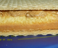 Mit der Hälfte der Creme nun den Biskuit bestreichen und Dann die Waffel gut andrücken.