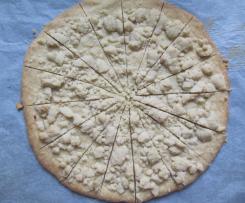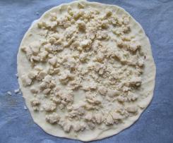 - Ein Backpapierblatt auf die Arbeitsfläche legen und aus einem Teigviertel darauf einen runden Boden drücken/rollen. Meiner hat einen Durchmesser von ca. 25 cm. Diesen Boden mit einem Viertel der Streusel bedecken und auf ein Backblech geben.