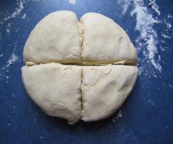 " Modus „Teig kneten“" kneten. - Den Teig auf die Arbeitsfläche geben. Mit leicht bemehlten Händen etwas nachkneten und mit einem Messer in vier Teile teilen.
