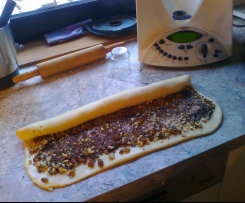 5. Die Teigplatte mit 3 EL zerlassener Butter beträufeln, mit Kristallzucker und Vanillezucker bestreuen, und die vorbereitete Fülle (Rosinen, Schokolade und Haselnüsse) darauf verteilen. Einrollen.