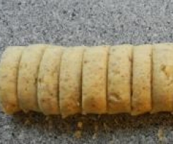 Ich hab 9 "Teigwürste" à ca. 80-85 daraus geformt und immer nur 2 zur Verarbeitung aus dem Kühlschrank genommen. Die dann in 8 Scheiben (ca.11g) und die Scheiben nochmals halbiert (ca.5g) zu Kipferl geformt und auf Dauerbackfolie bei 155°C Umluft 11 Minuten gebacken.