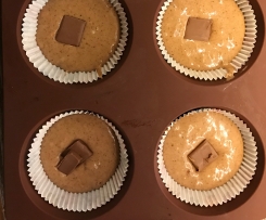 2 Esslöffel Teig in ein Muffinförmchen geben und ein Stück Nougat in die Mitte setzen wiederum mit 1-2 Esslöffel Teig bedecken