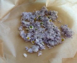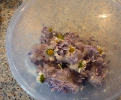 Verlesen Sie die Blüten. Beim Flieder z.B. nur die lila Blütenköpfe ( ohne Grün ) Gänseblümchenköpfe und bei den Veilchen dürfen die Stiele dranbleiben.