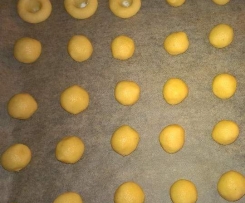 Den Teig nun zu kleinen Kugeln formen, Mulde eindrücken und mit Konfitüre füllen.