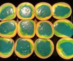 Nun ein Muffinblech mit Papierförmchen auslegen, jeweils 1 EL vom roten Teig in die Förmchen geben, dann 1 EL von dem orangenen Teig in jedes Förmchen geben, dann jeweils 1 EL vom roten Teig... etc. bis der Teig auf alle Förmchen verteilt ist.