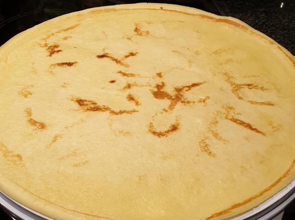 - Teig mit Hilfe einer kleinen Suppenkelle in eine Pfanne oder auf eine Crepes Platte geben und backen.