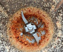 - Knoblauch und Peperoni zugeben und 6 Sek./ Stufe 10 zerkleinern, vom Rand runterschieben.