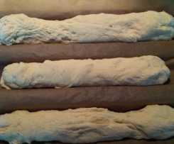 " Modus „Teig kneten“" mischen. - Den Teig auf bemehlter Unterlage zu einer Rolle formen, diese in 3 ca. gleich grosse Stücke aufteilen, welche wiederrum zu Rollen geformt werden und auf das Baguetteblech geben.