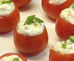 Mit einem Teelöffel die Creme in die Tomaten füllen und auf einem Teller anrichten. Den grünen Teil der Lauchzwiebel in Ringe schneiden und die Tomaten damit garnieren.
