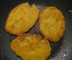 Den Teig mit dem Esslöfel zu kleinen Küchlein in die heiße Pfanne einstreichen.Ich verwende Butterschmalz oder Olivenöl zum Küchlein backen.