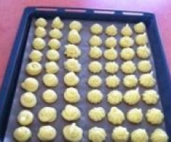 Schnell (sonst wird die Masse zu fest), die Masse in den Spritzbeutel füllen und kleine Röschen auf ein mit Backpapier ausgelegtes Backblech spritzen. Ca.15 Minuten backen, die Röschen sollten an den Spitzen braun sein.