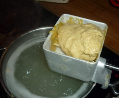 Die Kartoffeln pellen und in Stücken in den Mixtopf geben. Das Mehl, die Eier, das Wasser, Salz und Muskat dazu. Alles 2 1/2 Min./