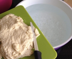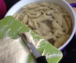 Einen Teil von dem Teig mit dem Teigschaber auf ein Brett geben und mit einem Messer Klösschen abschaben und in einen großen Topf kochendes Salzwasser geben.