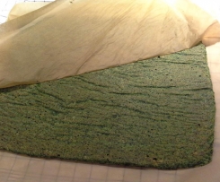 Wenn der Teig fertig gebacken ist, bitte auf ein Backpapier legen und auskühlen lassen. Wenn der Teig ganz abgekühlt ist, dann vorsichtig das Papier abziehen. Das geht nur, wenn der Teig erkaltet ist, sonst bleibt was hängen.