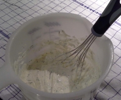 Den Dill waschen, trocken schütteln und klein schneiden ( oder gleich getrockneten nehmen ). Die Zitrone (Bio!) halbieren, die Schale abreiben und in eine Schüssel geben ( ich nehme einfacherweise die vom Eischnee). Den Saft auspressen und zur Seite stellen. Den Frischkäse in die Schüssel zur Zitronenschale geben, 2-3 EL Saft dazu ( bei 3EL ist es ziemlich zitronig! ) und den Dill dazugeben.Alles mit einem Schneebesen verrühren. Mit Salz und Pfeffer abschmecken.