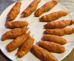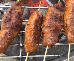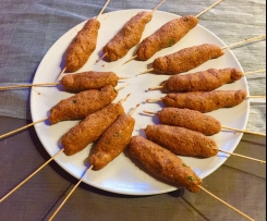 6. Mit gut angefeuchteten Händen kleine Röllchen formen und mittig Holzstäben durchschieben .Dünne Holzstäbchen reichen völlig , jedoch sollte dann darauf geachtet werden das die Masse gleichmäßig auf das Stäbchen verteilt ist , da sonst die Hackmasse einreißen könnte .