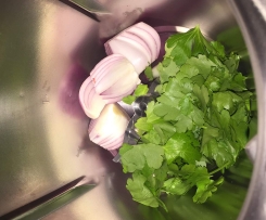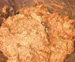 Die rote Zwiebel halbiert,3 Scheiben Toastbrot und die Petersilie in den Mixtopf geschlossen"Mixtopf geschlossen" geben .Messbecher einsetzen und  alles  6 SEC Stufe 7 zerkleinern .Alles mit dem Spatel nach unten Schieben .