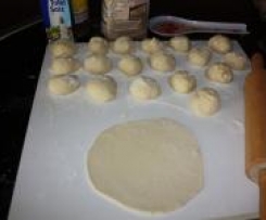 "Mixtopf geschlossen" ruhen lassen.Nach dem ruhezeit den Teig auf ein reichlich bemehlten arbeitsfläche tuhen und ca. 19 kleine förmchen vormen. Mit hilfe des Nudelholz Teig ausrollen siehe Bild