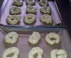 die Teigteile zu einer nicht zu dünnen Schlange formen, zwirbeln und rund zusammendrehen. Die Enden unter dem Teig zusammendrücken.