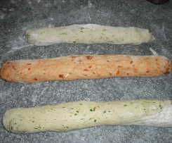 Etwas Olivenöl in die Hand geben und dann einen Teil mit Olivenöl benetzen und zu einen Baguettestange formen, etwas drehen und dann auf die Baguetteforn (mit ODER auch ohne Backpapier) legen. Das ganzen mit alles 3 Stücken wiederholen.