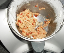 Das zweite Stück Teig und die Tomaten mit einem EL Mehl in den Mixtopf geben und 3 Sek. / Stufe 5 mixen. Teig rausnehmen!