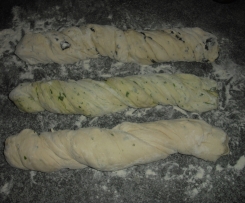 Mein TIPP: Die Teigstangen kann man auch in Stücke schneiden und mit der glatten Schnittseite nach Oben ODER als Schnecken auf ein mit Backpapier belegtes Backblech legen und ca. 20 Min. / bei 200 °C ( je nach Backofen - denn jeder kennt seinen Ofen am besten) goldbraun backen.