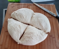 (Tortenbutler auch am besten einölen, oder mit Trennspray aussprühen, damit der Teig nirgends kleben bleibt...) - Den deutlich hoch gegangenen Teig wieder auf die eingeölte Arbeitsplatte kippen und in vier Teile schneiden...