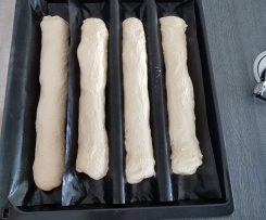 - Aus den einzelnen Teigstücken längliche Stränge formen, mit Wasser einsprühen und nochmal 20- 30 Min. gehen lassen.