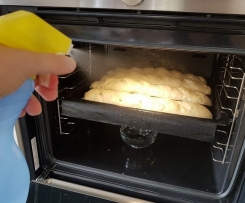 - Mit einem scharfen Messer die Baguette einritzen und wieder mit Wasser einsprühen.