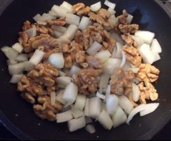 - Zwiebeln zusammen mit den Walnüssen in einer beschichteten Pfanne ohne Fett anrösten und abkühlen lassen.