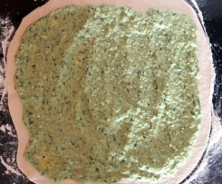 Einfacher geht das Aufrollen, wenn man den Teig auf einem Tuch oder Backpapier auswellt.