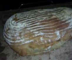 Den Teig auf das mit Backpapier belegten Backblech, oder wie ich auf einen heißen Pizzastein, stürzen und 15 Min. bei 250°C backen, danach auf 175°C runterschalten und weitere 30 Min. backen.